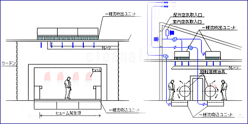 ヒューム発生源上部に一様流吹出ユニットを設置、また作業者足許に ピットを設けて一様流吸込ユニットを設置した。
