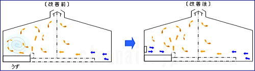 作業場内の空気の流れは、工場の一方(図では下側)を開放し、熱対流によって侵入する外気を利用し、炉並びに製品から発生する熱気流に巻き込んで排出していたが、一部は図の様に作業者の働く原料ヤード上に洩れ込んで吹きだまりとなっていた。