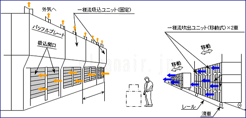 プッシュ装置を固定すると作業に支障となるので、有圧換気扇6基をひとまとめにした吹出ユニットを車2台にそれぞれ滑車を設けて移動式にし、作業域の移動に応じて随時設置位置を変更出来る様に、14mの間のレール上を動かす様にした。