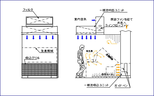除塵した室内空気をブース上方から一様流にして吹出し、呼吸域を保護すると共に溶接により発生するヒュームを含む熱気流の上昇を抑えて、前壁下方部の一様流吸込フードにより排出するプッシュ・プルブースを設置した。