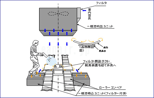 図の現状の吹出ユニットのある部分に上方排気フードが設置されていたが、ほとんど排気せず周辺に拡散していた。
